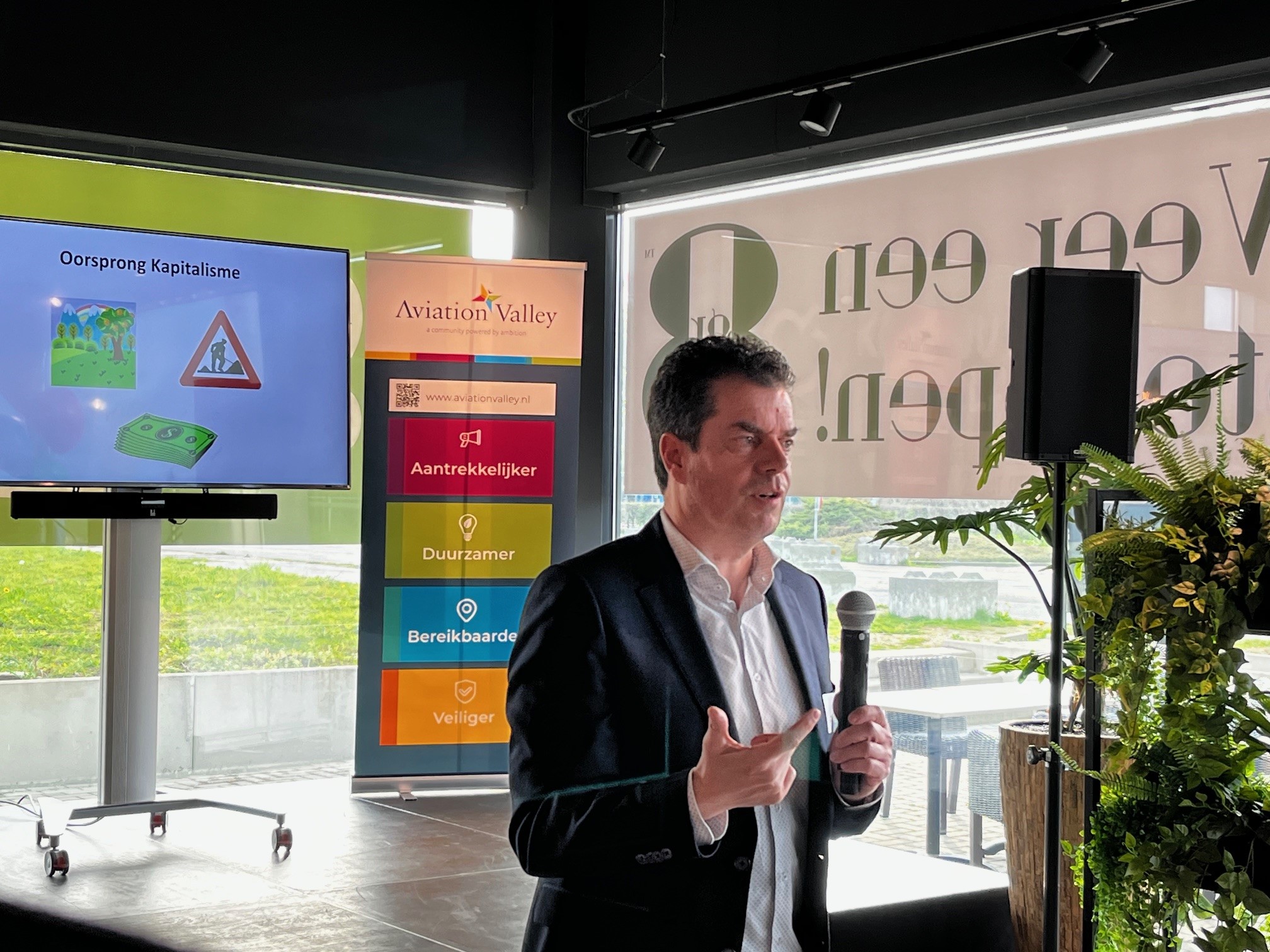 Hierna was het de beurt aan Jack Cox, een gerenommeerde spreker en auteur van het boek "De Vlindereconomie" en tevens ondernemer op Aviation Valley met zijn bedrijf Forza Asset Management. Jack deelde zijn inzichten over de duurzaamheid van ons financiële systeem, waarbij hij parallellen trok tussen de veerkracht van ecosystemen en de veerkracht die nodig is in de economie. Zijn inspirerende verhaal zette de toon voor verdere reflectie op de rol die bedrijven kunnen spelen in het bevorderen van duurzaamheid en veerkracht. Iedereen ontving zijn boek ‘De Vlindereconomie’.